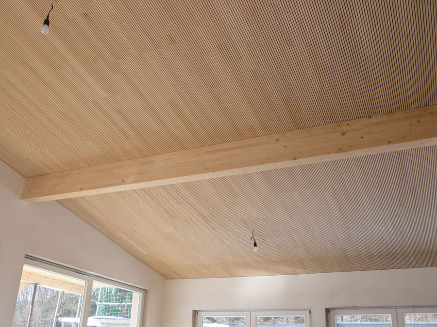 Es wurde alles verschafft. Woran das ästhetische Auge Anstoß nehmen könnte, wurde anderweitig in Wänden und Böden verarbeitet. Das Experiment hat tadellos funktioniert. Es wurde der komplette Stamm vom Stock bis zum Zopf im Haus verarbeitet. Wenn man bedenkt, welche Summen man für ein Haus ausgeben muss, fallen die (Mehr-)Kosten für das regionale Produkt Tannenholz kaum ins Gewicht. Letztendlich sind das im Gesamtvolumen nur ein paar Prozent, aber der optische und qualitative Effekt ist viel größer. Ein schönes Beispiel sind die Akustikdecken aus Tanne, die hauptsächlich aus optischen Gründen erste Wahl sind. Man muss es mit seinen Kunden besprechen, dann geht die Rechnung auf.